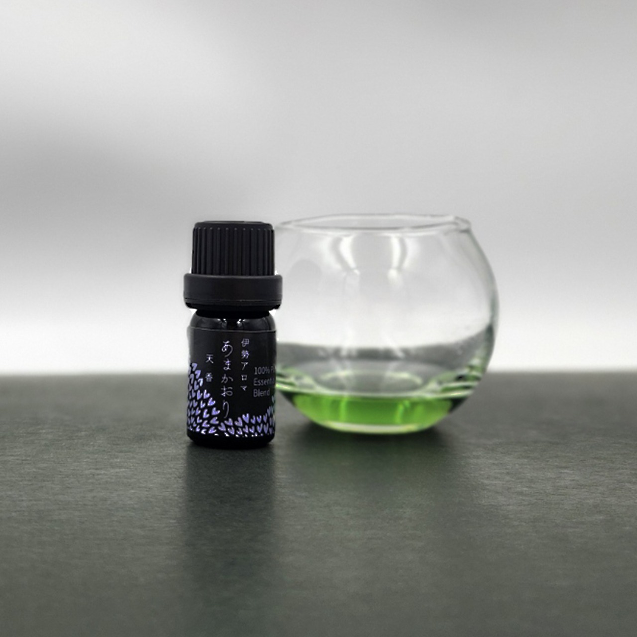 月夜のしずくを閉じ込めたような淡い青翠色の精油を、夜をイメージしたブラックボトルに入れてお届けします。