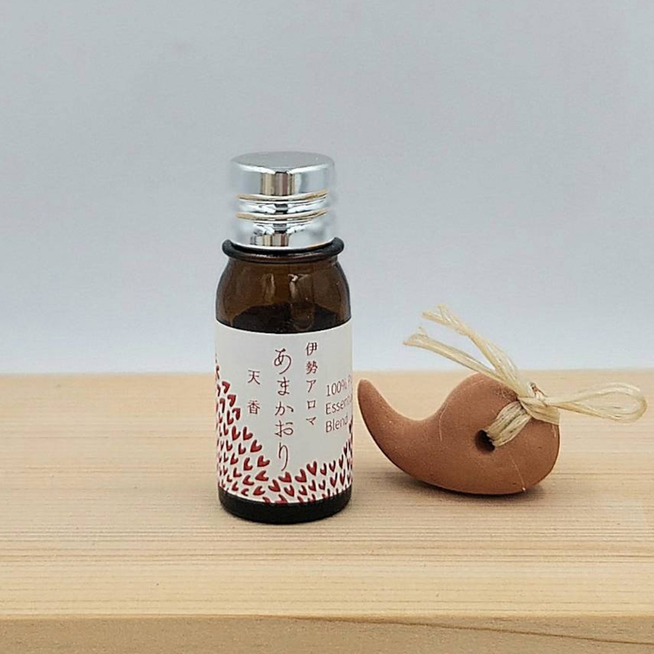 伊勢の地の土を使い、三種の神器の一つである「勾玉」をモチーフにした素焼きのアロマストーンを添えました。香りと共にお楽しみください。